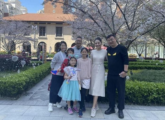 Cả nhà Hoa hậu Hương Giang hội ngộ gia đình một người bạn khi tới Thượng Hải chơi.