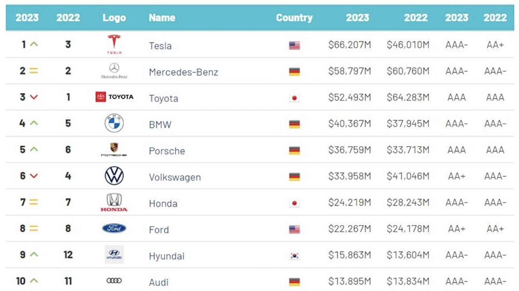 Bảng xếp hạng Top 10 thương hiệu ô tô giá trị nhất toàn cầu.