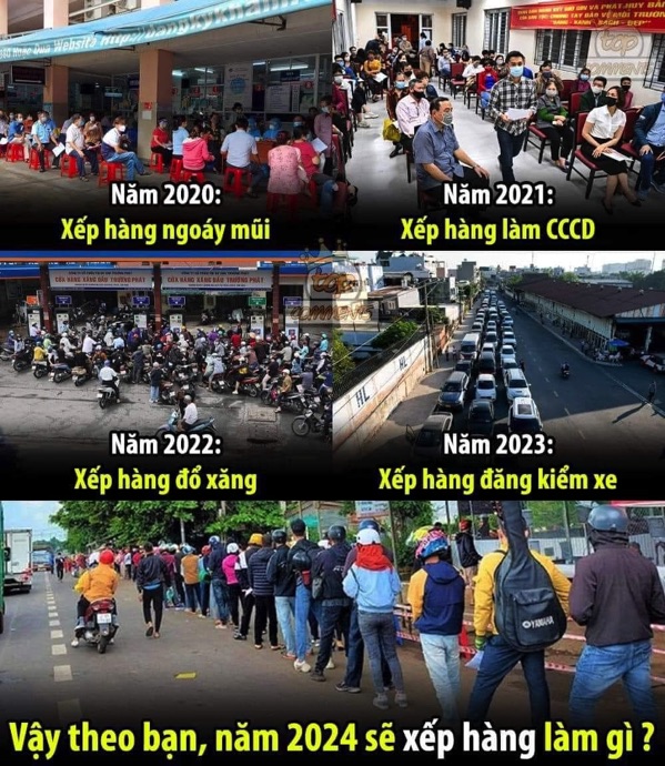 Mới đây trên mạng xã hội VN lan truyền hình ảnh cảnh xếp hàng. Vào năm nào người dân VN phải xếp hàng như 2020 ngoáy mũi test covid, năm 2021 xếp hàng làm CCCD căn cước công dân, 2022 xếp hàng đổ xăng, 2023 xếp hàng đăng kiểm xe.
