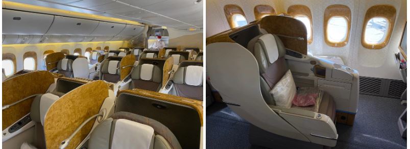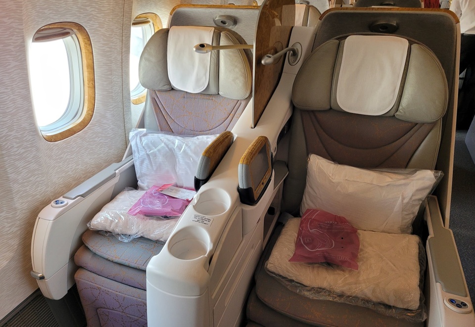 Thay vào đó, chuyến bay của cả hai được khai thác bởi chiếc Emirates 777-300ER, với ghế ngồi hạng thương gia thuộc hàng cũ kỹ nhất của hãng. Những chiếc ghế này không có tủ lạnh nhỏ đi kèm, ngoài ra cũng không thể duỗi thẳng thay giường nằm.