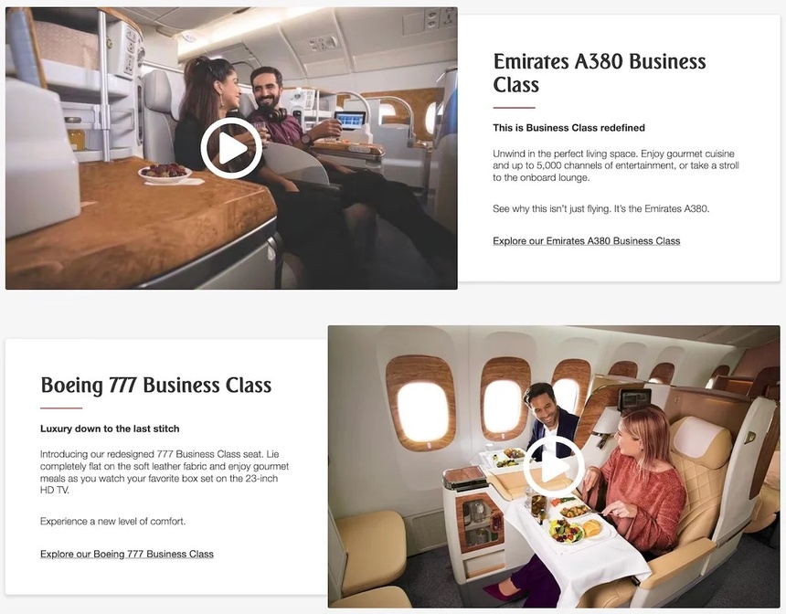 Hình ảnh quảng cáo về khoang hạng thương gia trên website của Emirates. Ảnh: News.com.au