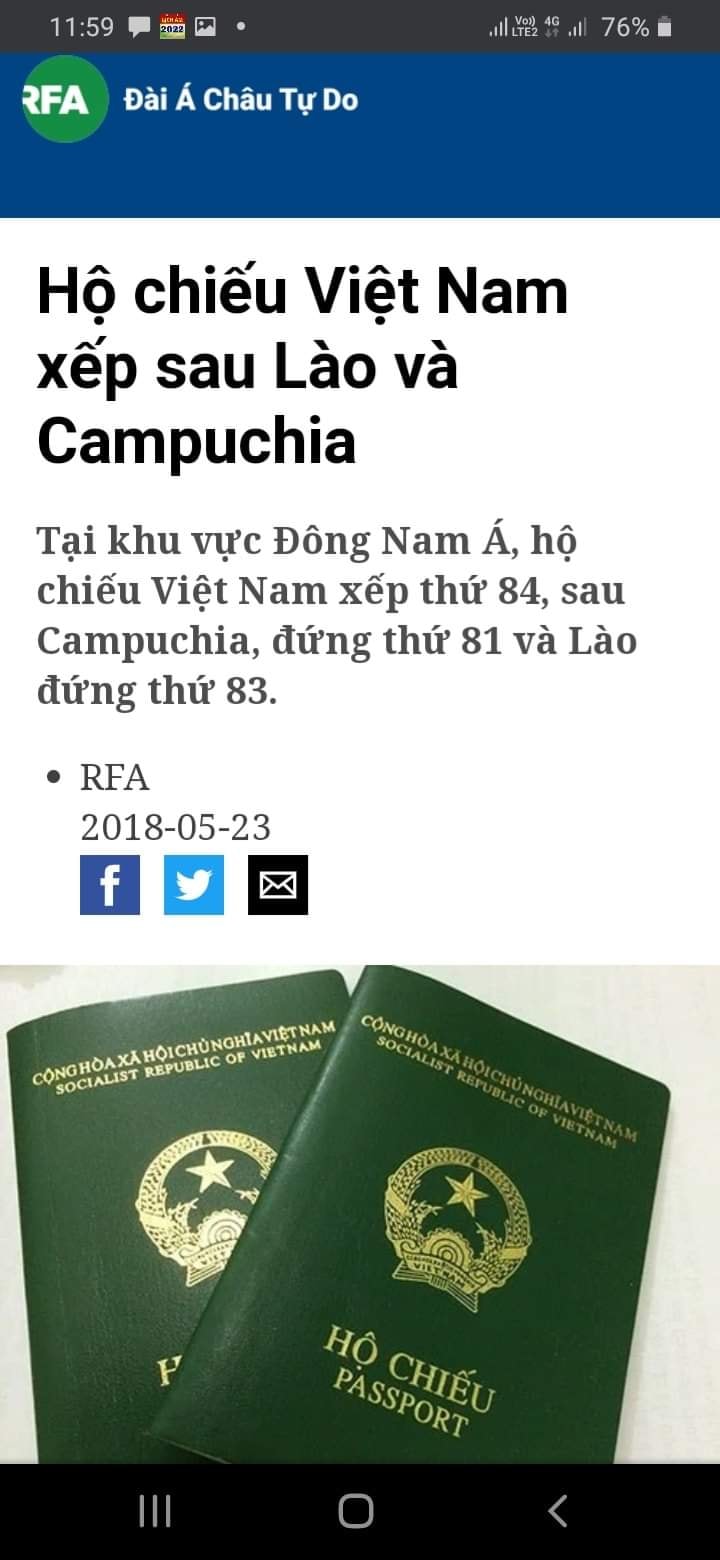 Singapore là 1 làng chài với diện tích nhỏ xíu. Họ không có 4 ngàn năm văn hiến, không có lănh tụ vĩ đại để ướp xác tôn thờ. Nhưng dân họ muốn nhập cảnh nước nào cũng được, chứ không có cảnh trốn chui trốn nhủi trong xe container đông lạnh, hoặc xâm nhập bất hợp pháp vào nước khác bằng chuyên cơ. Hộ chiếu của Singapore hiện nay quyền lực bậc nhất, xếp ngang hàng với Nhật Bản.