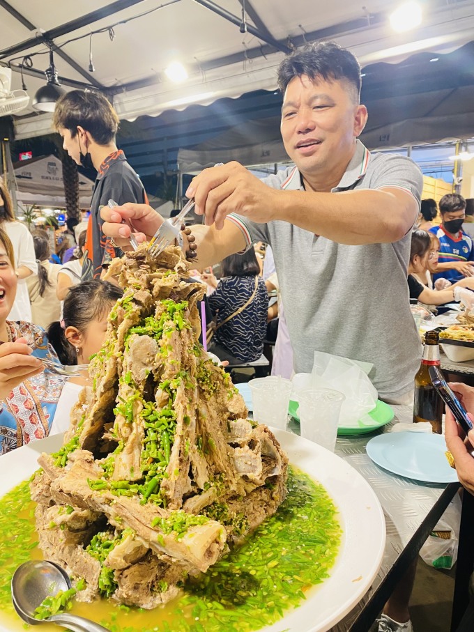 Từ khoảng 18h cho đến tận đêm khuya, khu ẩm thực trong chợ Rod Fai Ratchada luôn đông khách, khiến bạn phải xếp hàng và chờ đợi 30 phút đến 1 tiếng. Tại đây sườn được chia làm 4 size gồm M, L, XL và XXL, tùy thuộc số lượng người cũng như sức ăn.