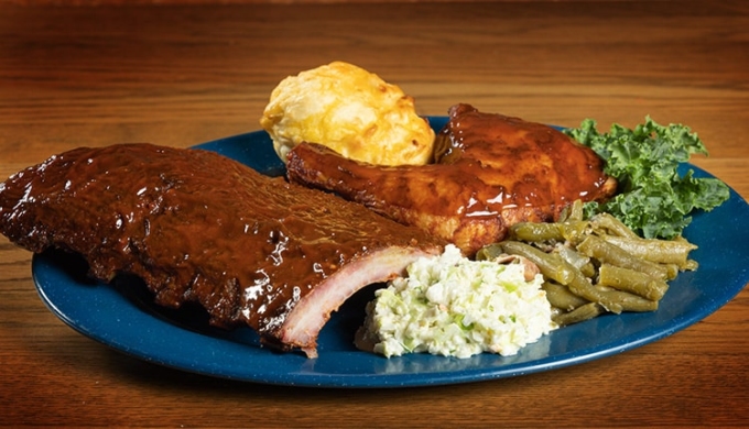 Đồ ăn tại quán Bennett’s Pit Bar-B-Que gồm thịt nướng, salad, khoai tây và rau. Ảnh: My pigeon forge