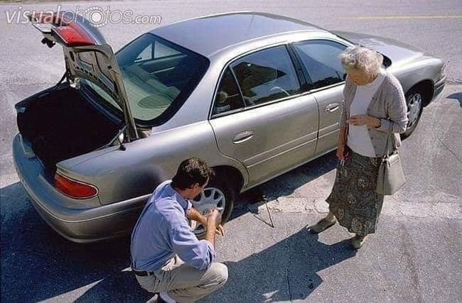 Một hôm một người đàn ông trông thấy một bà lão với chiếc xe bị xẹp lốp đậu bên đường. Tuy trời đã sẩm tối anh vẫn có thể thấy bà đang cần giúp đỡ. Vì thế anh lái xe tấp vào lề đậu phía trước chiếc xe Mercedes của bà rồi bước xuống.