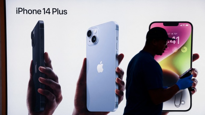 Một nhân viên Apple đi ngang qua biển quảng cáo iPhone 14 bên trong Apple Store. Ảnh: Reuters