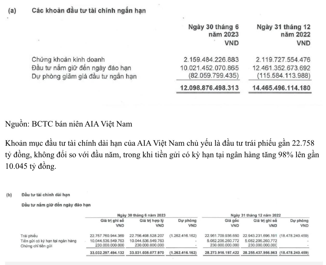 Khoản mục đầu tư tài chính dài hạn của AIA Việt Nam chủ yếu là đầu tư trái phiếu gần 22.758 tỷ đồng, không đổi so với đầu năm, trong khi tiền gửi có kỳ hạn tại ngân hàng tăng 98% lên gần 10.045 tỷ đồng.