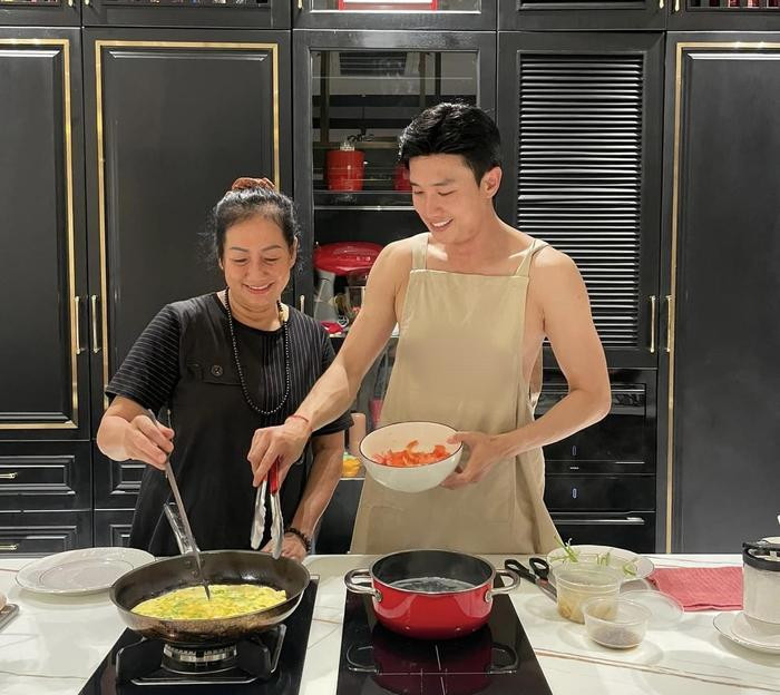 Quốc Trường và mẹ nấu ăn. Ảnh: FBNV