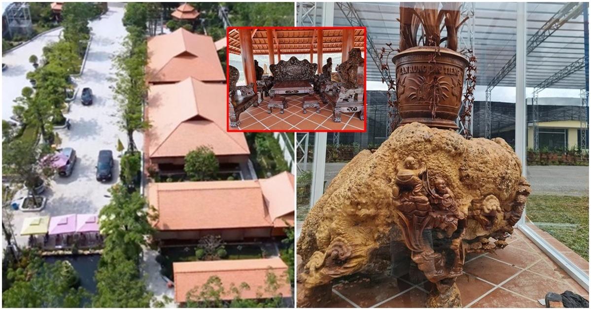 Bên trong khuôn viên biệt phủ này còn có gần chục bộ bàn ghế bằng gỗ quý, gia chủ cũng sưu tập nhiều tượng, phù điêu, nội thất gỗ toàn những loại đắt đỏ. Tiêu biểu phải kể đến bộ bàn ghế khổng lồ làm từ gỗ cẩm Việt – 1 loại gỗ có giá trị cao, có hương thơm đặc trưng, vân đẹp; Sập bằng đã Lục Yên nguyên tấm; bộ lục bình bằng gỗ cẩm vàng, bộ bàn ghế bằng gỗ hương chạm trổ cực kỳ tỉ mỉ, công phu, chạm khắc rồng 3 năm mới thành, đục thủ công bằng tay cũng được chủ nhân yêu quý. Trong phòng phụ này còn có phản làm từ khối gỗ cẩm Nam Phi cực kỳ lớn, dày cỡ hơn 1m; có bộ bàn ghế bằng gỗ trắc khắc rồng, bát tiên quá hải giá trị khoảng hơn 10 tỷ…