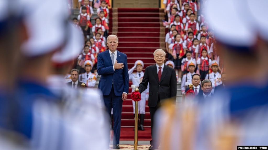 Tổng thống Biden đến Việt Nam theo lời mời của Tổng bí thư Trọng và đây là lần đầu tiên một vị tổng thống Mỹ đến công du cấp nhà nước ở Hà Nội mà không phải do người đồng cấp mời. Ông Biden gặp người đứng đầu đảng Cộng sản trước khi gặp những người còn lại trong ‘tứ trụ’ lãnh đạo Việt Nam. Tuyên bố chung nâng cấp quan hệ cũng do ông Trọng đưa ra cùng Tổng thống Biden.
