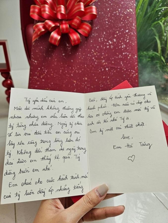 Thanh Hằng không buồn mà bày tỏ sự xúc động trước tình cảm của đàn em. Cô khoe hình ảnh món quà và tấm thiệp từ Hà Tăng với khán giả.