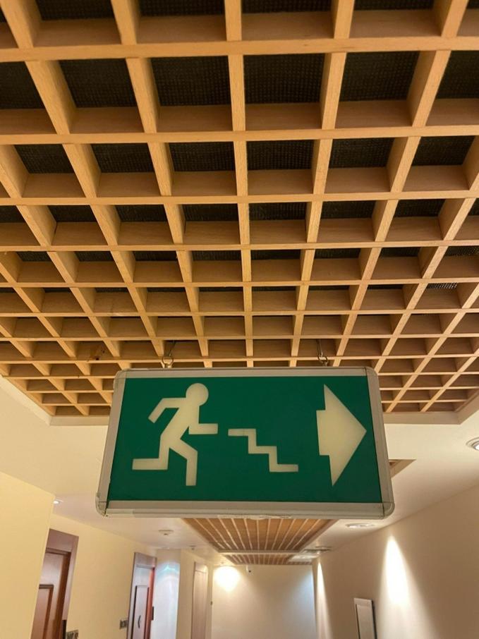 Còi hú như còi xe cứu thương cùng lúc vang lên. Nhân viên khách sạn nhanh chóng dẫn đoàn vào phòng trú ẩn. Nơi này chính là khu vực thang bộ thoát hiểm trong các chung cư, khách sạn cao tầng. Du khách được hướng dẫn đứng tại chiếu nghỉ cầu thang thoát hiểm. Khu vực chiếu nghỉ có đèn sáng, đủ chỗ cho 20 người đứng và là nơi an toàn nhất trong tòa nhà.