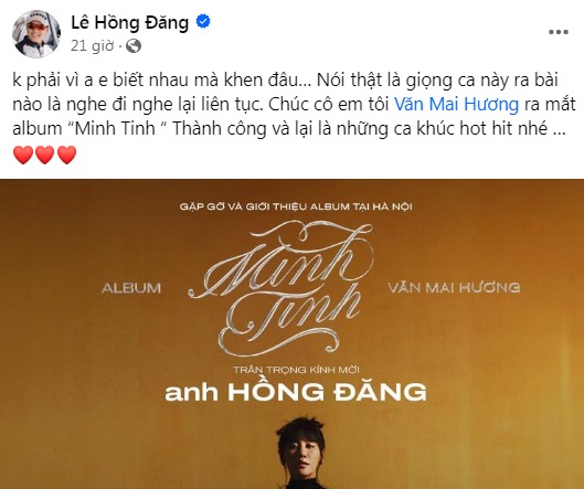 Mới nhất, Hồng Đăng đăng ảnh thiệp mời tham gia sự kiện ra mắt album mới của Văn Mai Hương. Đây được xem là lần hiếm hoi nam diễn viên có động thái liên quan đến hoạt động showbiz nên nhiều người đặt ghi vấn cho rằng Hồng Đăng sắp sửa tái xuất. Anh còn khen ngợi Văn Mai Hương có "giọng ca này ra bài nào là nghe đi nghe lại liên tục". Sau cùng, Hồng Đăng gửi lời chúc đến đàn em.