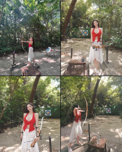 Trên trang Instagram cá nhân của mình. Nàng hot girl Huang Lin đăng tải loạt ảnh đi bắn cung ở Malaysia, gây chú ý với trang phục tôn dáng nổi bật. Theo đó, trong hình người đẹp này diện áo thun màu đỏ với chi tiết cắt khoét hở lưng, xẻ sâu, kết hợp cùng chân váy dây rút, ôm sát, mỏng manh tôn số đo v3.