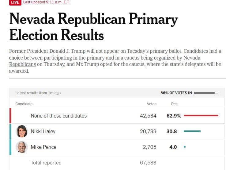 Hôm qua bầu cử sơ bộ Tổng thống ở Nevada. Ông Trump không có tên trên phiếu bầu . Tuy nhiên bà Nikki Haley vẫn thua đậm. Với khoảng 600 ngàn cử tri công hoà ghi danh như chỉ có khoảng 70 ngàn người đi bầu.