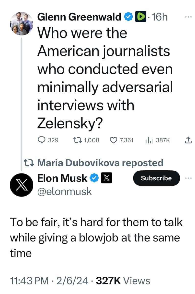 -Có người hỏi Elon Musk: có nhà báo nào phỏng vấn Zelensky chưa? Thì anh Musk trả lời Sao phỏng vấn gì được. Miệng tụi nó đang thổi kèn mà làm sao hỏi han gì .