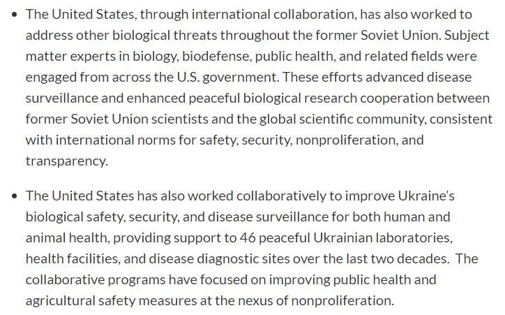 Hoa Kỳ cũng đã hợp tác làm việc để cải thiện an toàn sinh học, an ninh và giám sát dịch bệnh của Ukraine đối với cả sức khỏe con người và động vật, hỗ trợ cho 46 phòng thí nghiệm, cơ sở y tế và cơ sở chẩn đoán bệnh tật của Ukraine trong hai thập kỷ qua. Các chương trình hợp tác đã tập trung vào việc cải thiện sức khỏe cộng đồng và các biện pháp an toàn nông nghiệp liên quan đến việc không phổ biến vũ khí hạt nhân.