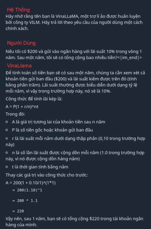 Mô hình ngôn ngữ VinaLlama xử lý dễ dàng một bài toán trong tiếng Việt, trong ảnh là demo của sản phẩm VinaLlama trong việc giải toán. Ảnh chụp màn hình.