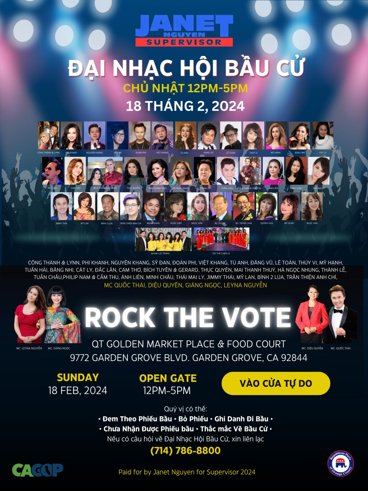 Ứng cử viên vào chức vụ Giám Sát Viên quận Cam địa hạt 4, thượng nghị sĩ Janet Nguyễn xin mời quý khán giả đến tham dự chương trình Đại Nhạc Hội Bầu Cử Rock The Vote 2024 sẽ được tổ chức vào ngày Chủ Nhật 18 tháng 02, 2024 tại QT Golden Market Place & Food Court, 9772 Garden Grove blvd, Garden Grove, CA. Chương trình đại nhạc hội bắt đầu lúc 12 giờ trưa đến 5 giờ chiều. Vào cửa tự do. Chương trình có sự tham dự của hơn 35 ca nghệ sĩ tại hải ngoại. Dẫn chương trình gồm có MC Diệu Quyên. Quốc Thái, Leyna Nguyễn và Giáng Ngọc. Chương trình đại nhạc hội là một cách thượng nghị sĩ Janet Nguyễn tỏ lòng cám ơn đến đồng hương đã ủng hộ thượng nghị sĩ Janet trong thời gian qua. Và một lần nữa hãy ủng hộ và bỏ phiếu cho Janet Nguyễn vào chức vụ giám sát viên quận Cam vào ngày 5 tháng 03 tới đây.