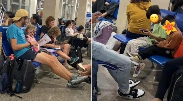 Phía đối diện bên kia cũng là những gia đình có 2 đứa trẻ là người Việt Nam, hai đứa trẻ cũng ngồi ngoan ngoãn trên băng ghế chờ nhưng thay vì đọc sách như trẻ phương Tây thì mỗi đứa trẻ được cha mẹ cho sử dụng một chiếc điện thoại để xem chương trình mà bé yêu thích.