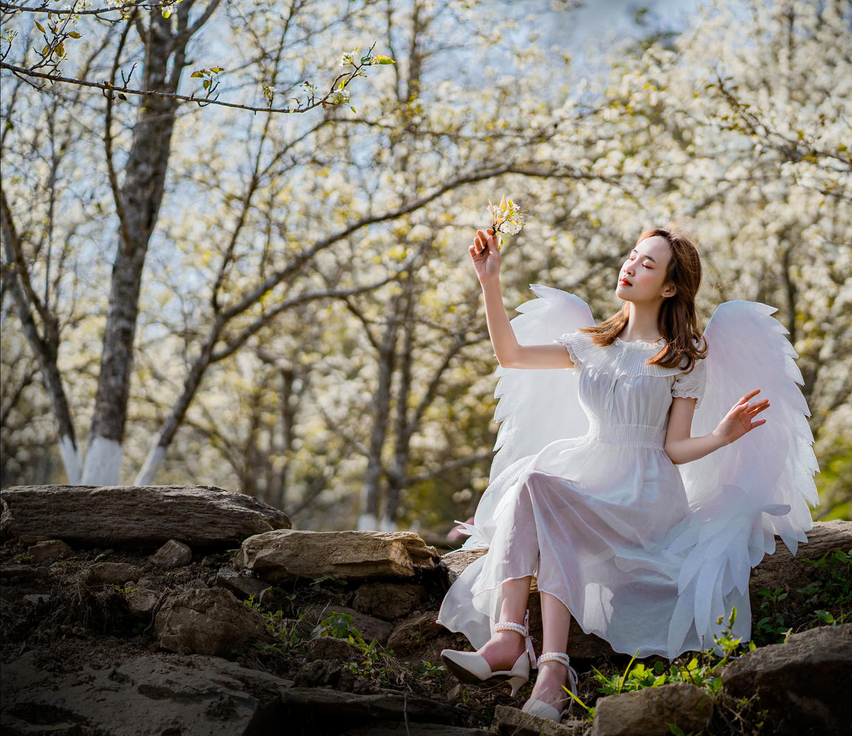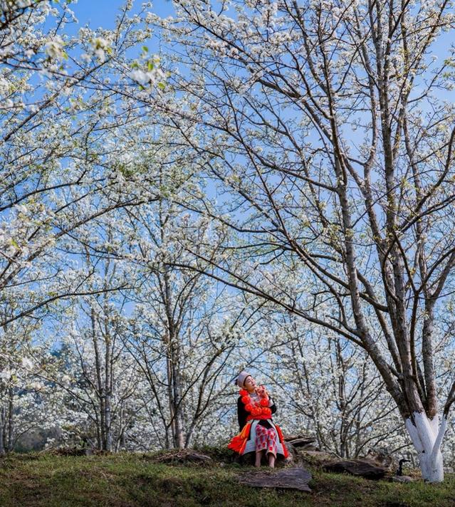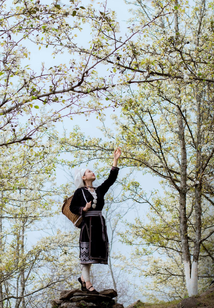 Du khách check in vườn lê với trang phục dân tộc Dao đỏ (Ảnh: Lưu Minh Phụng)