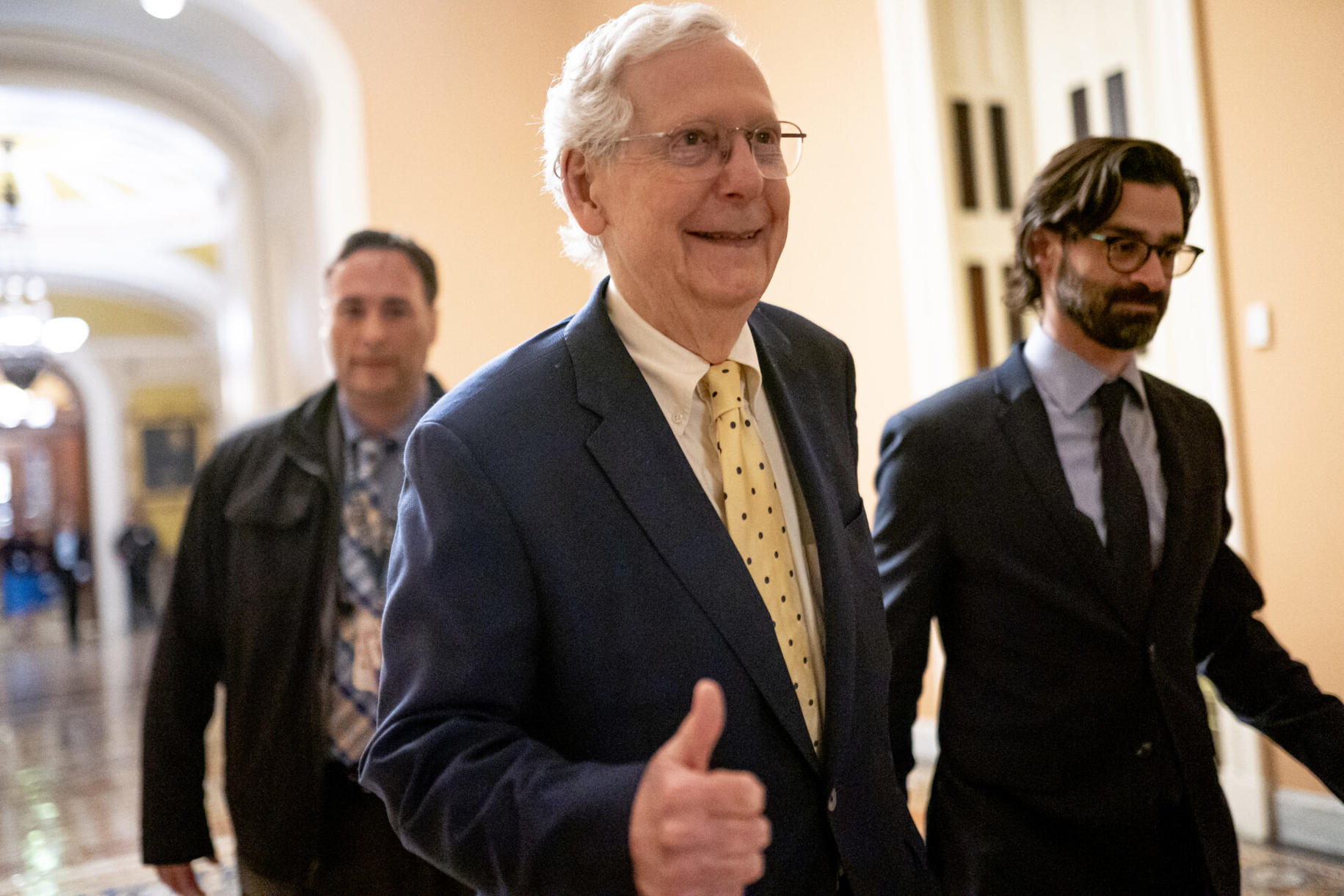 Trưởng Khối Thiểu số Thượng Viện, Thượng nghị sĩ Mitch McConnell (CH-Kentucky) rời phòng họp Thượng Viện sáng sớm hôm 23/3/2024 ở Washington, DC sau khi thông qua ngân sách quốc gia (Hình: Nathan Howard/Getty Images)