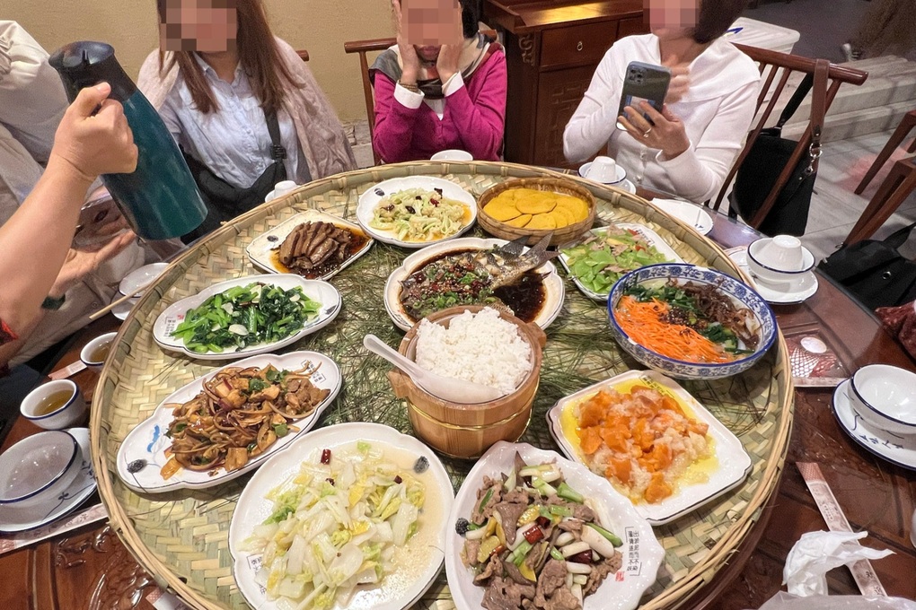 Bữa cơm rau nhiều hơn thịt trong một tour Trung Quốc giá rẻ của khách Việt (Ảnh: Nhân vật cung cấp).