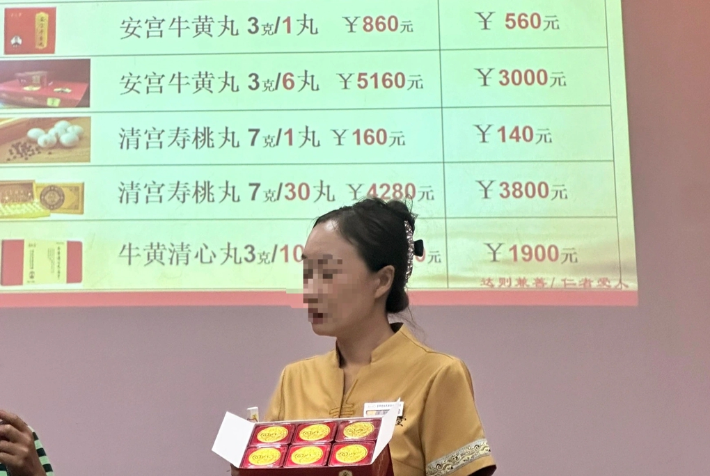 Một nhân viên bán hàng Trung Quốc tiếp thị sản phẩm thuốc Đông y cho du khách Việt (Ảnh: Nhân vật cung cấp).