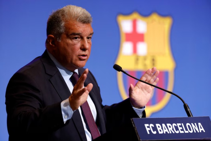 Chủ tịch Laporta trong một cuộc họp báo ở sân Camp Nou ngày 17/4/2023. Ảnh: Reuters.