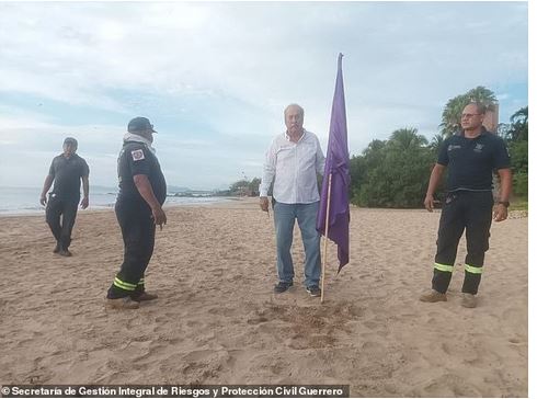 Một người đàn ông cầm một lá cờ màu tím để thông báo cho những du khách biết rằng sinh vật biển nguy hiểm đã được nhìn thấy trong khu vực.
