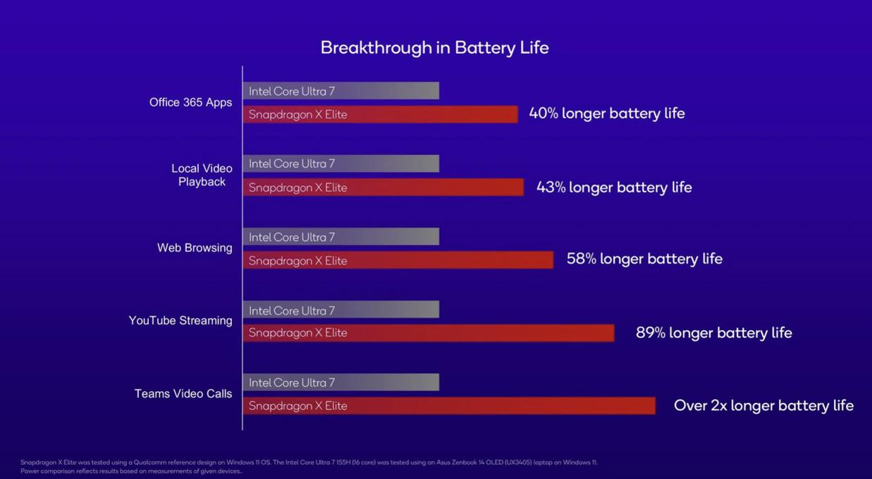 Theo công bố chính thức, Qualcomm tuyên bố thời lượng phát video liên tục trên 25 giờ. Trong thử nghiệm phát lại video cục bộ, thời lượng pin ước tính dài hơn 43% so với CPU Intel Core Ultra.