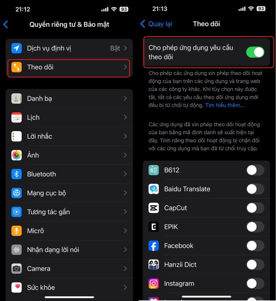 Tại mục Theo dõi này, bạn sẽ thấy tùy chọn "Cho phép ứng dụng yêu cầu theo dõi". Bạn có thể tắt toàn các ứng dụng đang theo dõi hoặc lựa chọn tắt từng ứng dụng cụ thể.