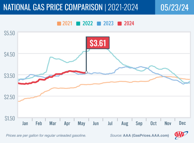Đến ngày 24/5, giá xăng trung bình toàn quốc tại Mỹ đạt 3,609 USD mỗi gallon (3,78 lít), cao hơn một chút so với mức trung bình kể từ năm 2020, theo AAA. California là bang có giá xăng cao nhất, với trung bình 5,138 USD mỗi gallon, trong khi thấp nhất tại Wisconsin, trung bình chỉ 3,444 USD mỗi gallon. Giá xăng ở Mỹ hiện rẻ hơn 30% so với tháng 6/2022, khi đạt kỷ lục trên 5 USD một gallon.