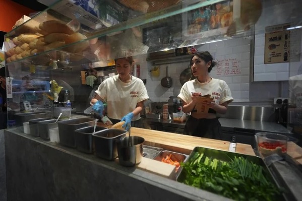 Kiki Phụng (phải) và Hạnh Đặng tại quầy phục vụ bánh mì tại Bánh Mì Nếm.