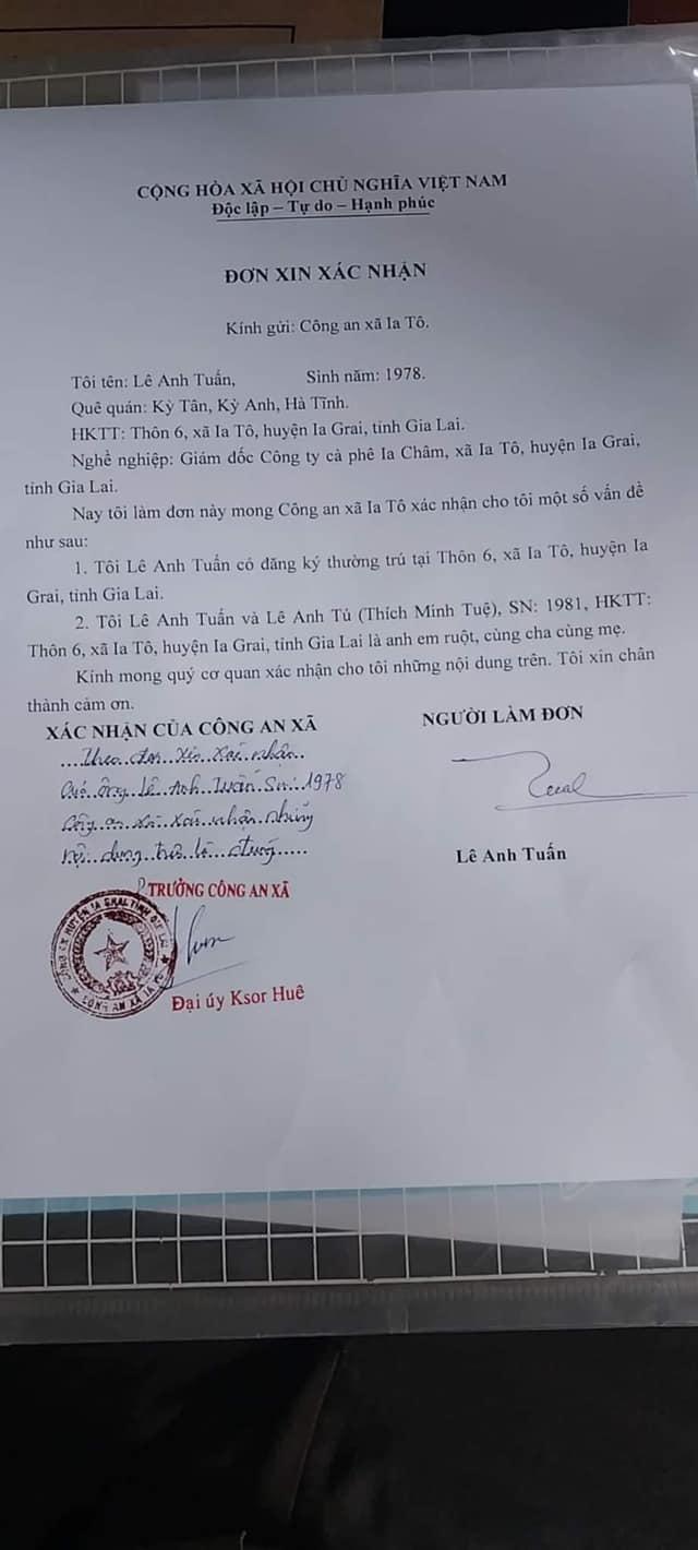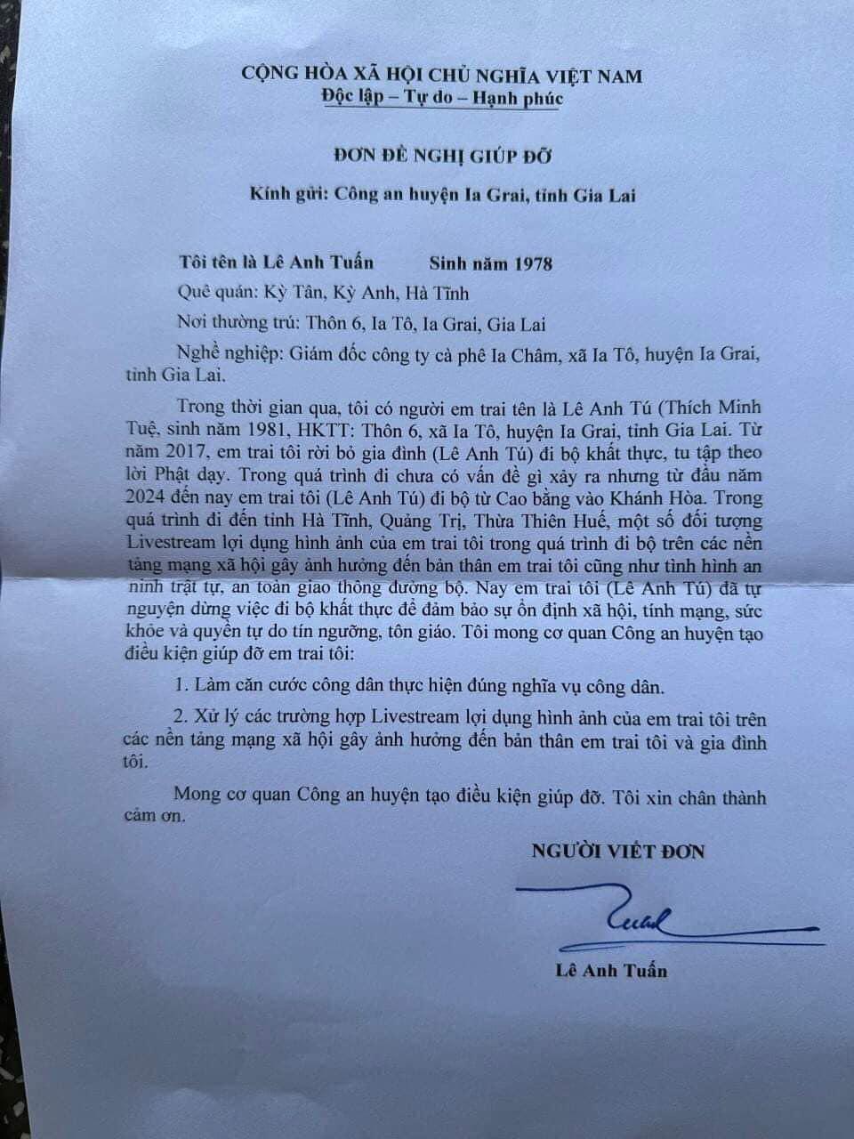 Được biết, ngày 9-6-2024 xuất hiện lá đơn của ông Lê Anh Tuấn, anh ruột thầy Thích Minh Tuệ, xin công an huyện Ia Grai (Gia Lai) làm căn cước công dân cho Thầy, và yêu cầu công an “xử lư các trường hợp livestream xử dụng h́nh ảnh của em trai tôi trên các nền tảng mạng xă hội gây ảnh hưởng đến em trai tôi và gia đ́nh tôi.”