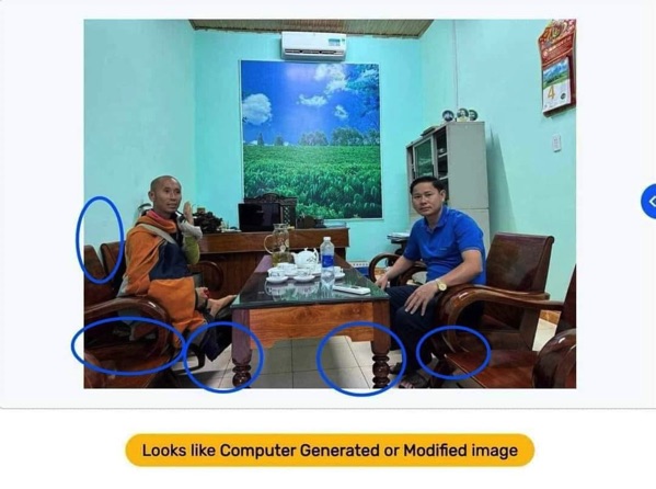 - Nó được dời qua bên tay phải của thầy. Mọi người nh́n kỹ sẽ thấy cái tay ghế nằm trên ngay giữa băng ghế dài. Một bộ như này thường có một ghế dài, 4 ghế đơn. Nh́n phía bên người áo xanh ngồi có thể thấy rơ tay vịn được ráp vào 2 bên ngoài thân ghế. Trong khi ghế thầy ngồi th́ được cắm vào giữa ghế dài bằng Photoshop. Không có cái ghế dài nào làm một cái tay vịn ở giữa ghế như này. Kỹ năng phootoshop rất kém, nh́n thấy rơ bằng mắt thường.