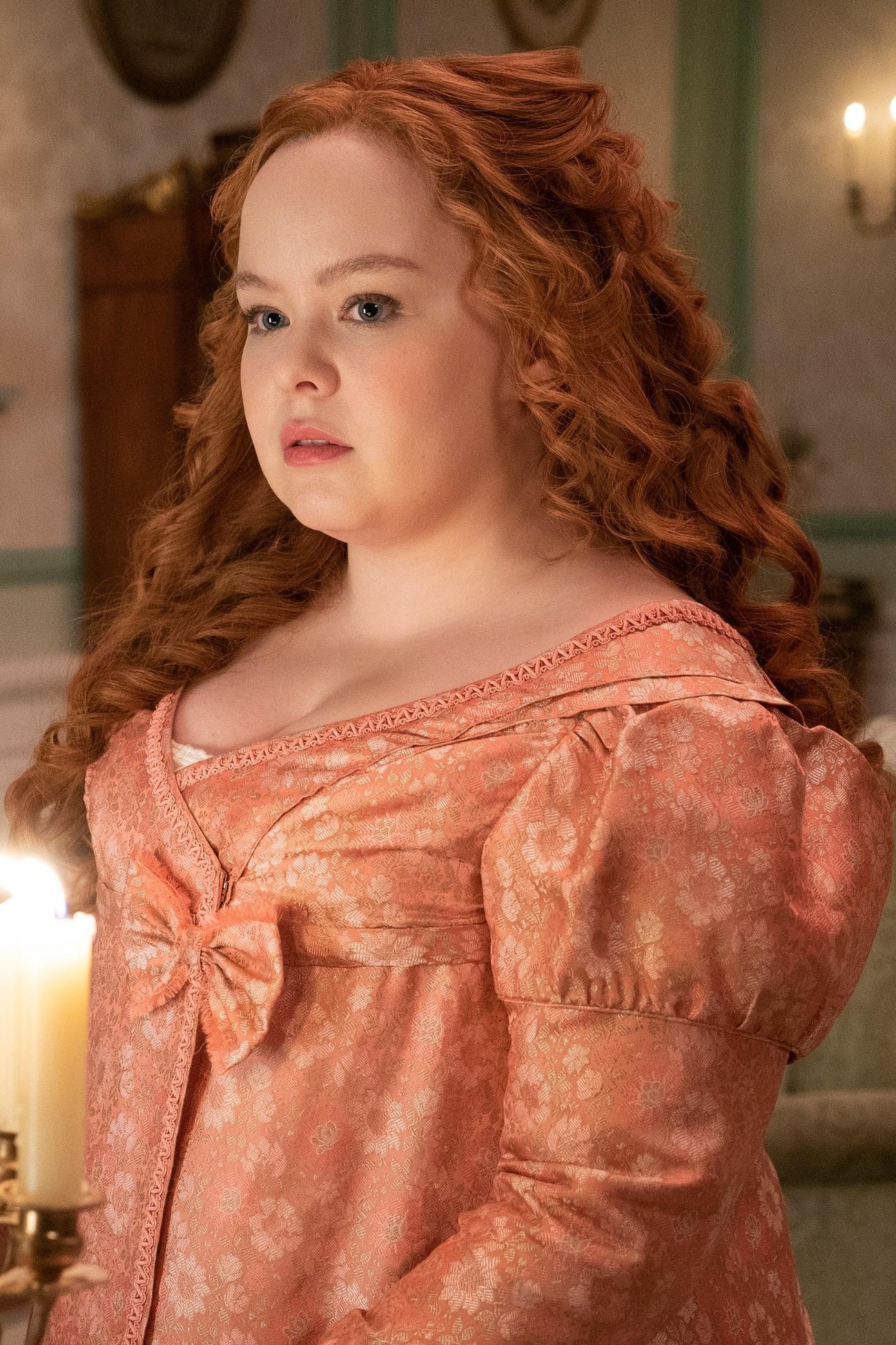 Trong phim, Penelope được mô tả là cô gái có ngoại hình mũm mĩm, không phù hợp với thị hiếu nhan sắc của thời đại. Cùng với cách ăn mặc màu mè, trẻ con, Penelope được xem là không thu hút trong mắt các thanh niên quý tộc chưa vợ. Trong gia đình, cô không được mẹ xem trọng, thường xuyên bị hai chị gái bắt nạt, từ đó hình thành tính cách rụt rè, tự ti. Tuy nhiên, ẩn sâu trong vẻ ngoài lệch chuẩn là cô gái thông minh và luôn khao khát chứng tỏ bản thân. Đó là lý do cô quyết định tạo cho mình vỏ bọc Quý bà Whistledown - cây bút sắc sảo chuyên phơi bày các bí mật trong giới quý tộc Anh. Đây là một trong những nhân vật quan trọng nhất trong phim, có vai trò kết nối tất cả mùa của Bridgerton. Ảnh: Netflix.