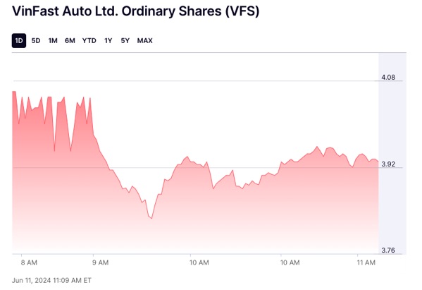 Cổ phiếu Vinfast đã tăng 100% kể từ lúc mất giá kỷ lục còn 2 USD/ share. Ngày 11/6/2024 cổ phiếu Vinfast đã tăng tới 4 USD nhờ lởi thế kinh doanh xe taxi tại VN.