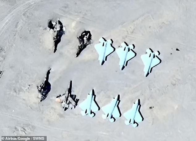 Các bức ảnh vệ tinh cho thấy những vết cháy xém lớn bên cạnh các mẫu mô phỏng máy bay chiến đấu hiện đại trên và một đường băng dài với nhiều vết xước. Nhiều máy bay phản lực xếp hàng gần khu vực diễn tập.