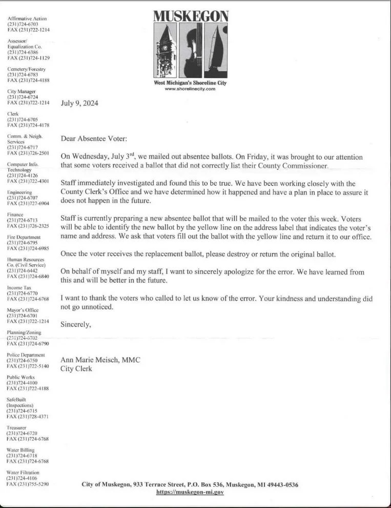 Thư ký thành phố Muskegon Ann Meisch đã viết cho cư dân, “Vui lòng tiêu hủy hoặc trả lại lá phiếu gốc.”