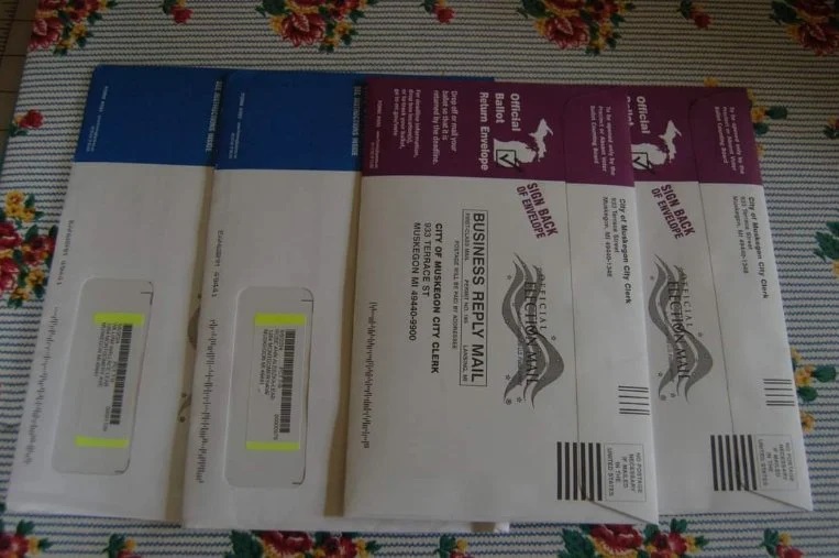 Lá thư được gửi tuần này từ Thư ký thành phố Muskegon tới cử tri, giải thích rằng hai bộ phiếu bầu vắng mặt sẽ được gửi đến tận nhà họ.
