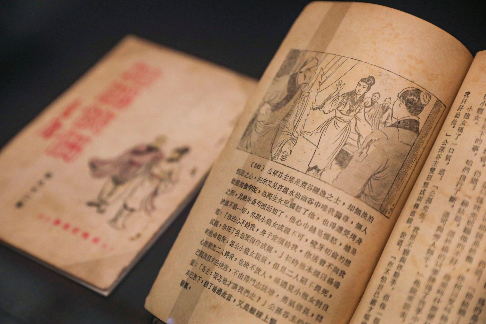 Ấn bản b́a mềm của "Thần điêu đại hiệp" (1959) của Kim Dung được trưng bày tại Pḥng trưng bày Jin Yong thuộc Bảo tàng Di sản Hồng Kông. Ảnh: Nora Tam