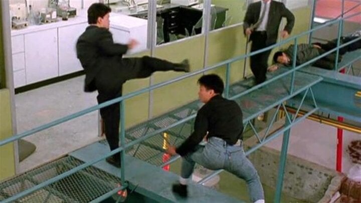 Tiền Gia Lạc đóng thế cho Thành Long (ảnh trên) và Nguyên Bưu (ảnh dưới) trong cảnh quay hành động nguy hiểm phim "Phi long mãnh tướng".