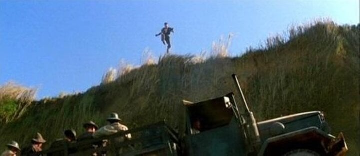 Tiền Gia Lạc đóng thế cho Hồng Kim Bảo ở phân cảnh nhảy khỏi sườn đồi xuống thùng xe tải phim "Phi ưng phương Đông".