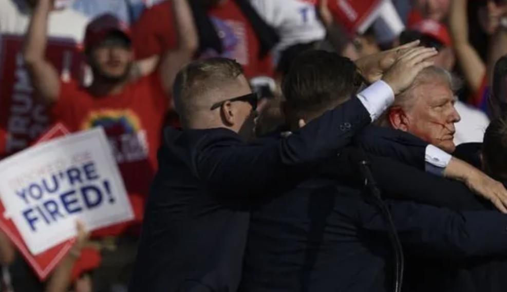 Ông Trump được nhân viên mật vụ bao quanh sau khi có tiếng súng vang lên tại một cuộc vận động tranh cử ở Butler, Pennsylvania. Ảnh: AFP / Jeff Swensen