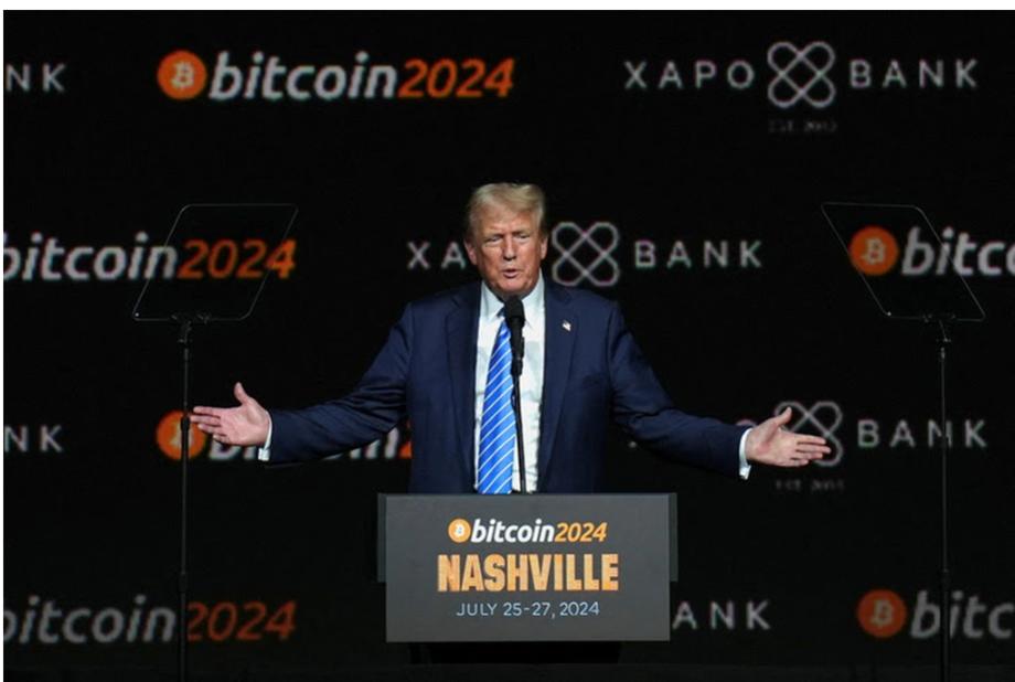 Cựu Tổng thống Mỹ cũng gọi bitcoin là "ngành công nghiệp thép của 100 năm trước" và đưa ra một loạt cam kết chính sách thân thiện với tiền điện tử và sẽ lập "kho dự trữ bitcoin chiến lược quốc gia" để đưa tiền ảo thành "tài sản quốc gia lâu dài để mang lại lợi ích cho tất cả người Mỹ".