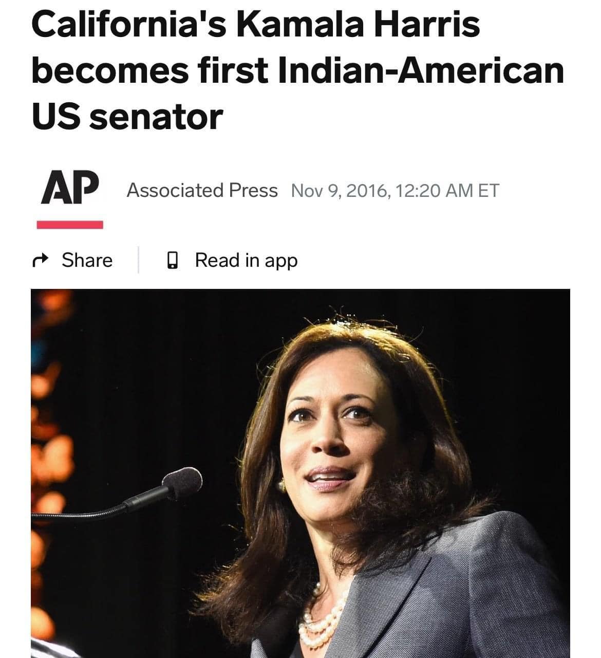 Hãng AP có thể làm điều đó với Kamala Harris khi ngày 9/11/2016 hãng này loan tin Harris trở thành người Mỹ gốc Ấn đầu tiên trở thành nghị sĩ Hoa Kỳ.