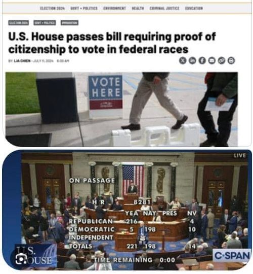 Hạ viện Hoa Kỳ với tỷ lệ 221-198 Dân biểu đã thông qua dự luật : Chỉ có Công Dân Mỹ mới có quyền đi bầu bỏ phiếu. Theo dự luật này yêu cầu các cá nhân đăng ký bỏ phiếu cung cấp bằng chứng về quyền công dân để tham gia bầu cử liên bang. Đạo luật cũng sẽ yêu cầu các bang kiểm tra danh sách cử tri của họ để tìm những người không phải là công dân đã đăng ký. Vì hành động bỏ phiếu đó đã là bất hợp pháp, chiếu theo luật hiện hành của Hoa Kỳ, chỉ công dân mới có thể bỏ phiếu trong các cuộc bầu cử liên bang.