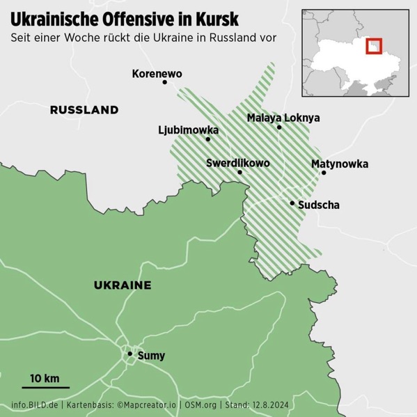 Ngày 12 tháng 8, trong cuộc họp của Bộ tư lệnh, Tổng tư lệnh Lực lượng vũ trang Đại tướng Oleksandr Syrskyi đã báo cáo rằng lực lượng Ukraine kiểm soát khoảng 1.000 km2 lãnh thổ Nga ở tỉnh Kursk và tiếp tục tiến hành chiến dịch tấn công.