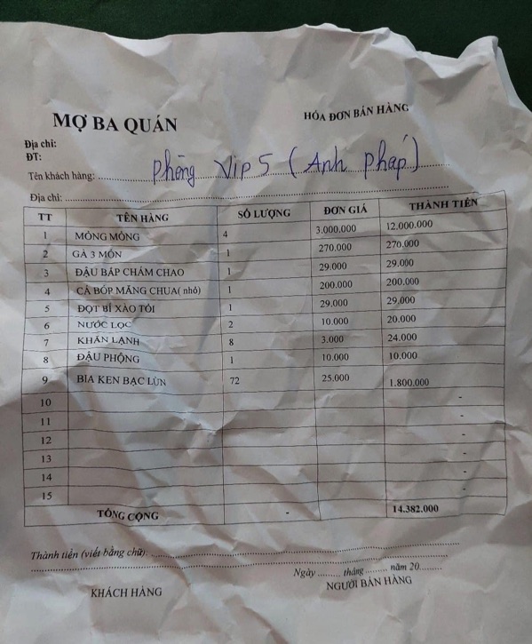 Hoá đơn liệt kê 4 suất mỏng mỏng giá 3 triệu.